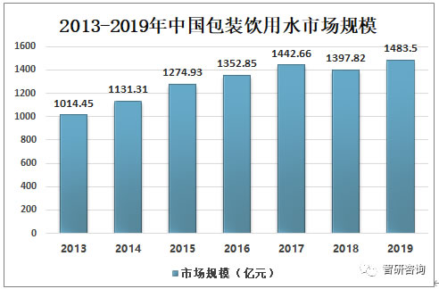 2013-2019年中國包裝飲用水市場規(guī)模整體呈增長態(tài)勢,2019年中國包裝飲用水市場規(guī)模約為1483.5億元,較2018年的1397.82億元同比增長6.13%。