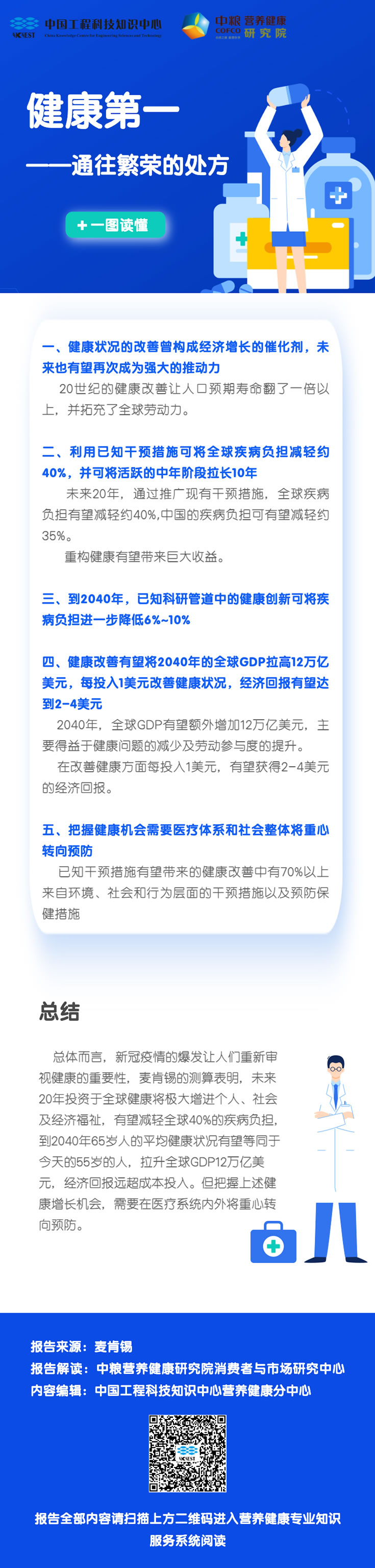 【編者的話】健康的重要性不言而喻,但每個(gè)個(gè)體對(duì)健康重要性的理解以及為健康而采取的行動(dòng)有較大差異。不妨回顧一下,你是在什么時(shí)候,第一次真正覺得要重視自己的健康了呢?那時(shí)候發(fā)生了什么事情?健康不僅對(duì)個(gè)體而言非常重要,在宏觀層面對(duì)社會(huì)和經(jīng)濟(jì)發(fā)展的影響也彌足輕重。上世紀(jì)50年代我國(guó)人均壽命還僅40歲出頭,2019年這一數(shù)據(jù)已達(dá)77歲,健康水平的提升帶來(lái)了更龐大、健康的勞動(dòng)力。近幾年的研究結(jié)果表明,健康對(duì)經(jīng)濟(jì)增長(zhǎng)的貢獻(xiàn)與教育不相上下。未來(lái)20 年,健康將會(huì)如何影響經(jīng)濟(jì)、社會(huì)及我們每個(gè)人的生活?麥肯錫的這篇《健康第一:通往繁榮的處方》分析了改善世界人口健康所需要采取的措施,并計(jì)算了這些措施能給個(gè)人、社會(huì)及經(jīng)濟(jì)帶來(lái)的收益。