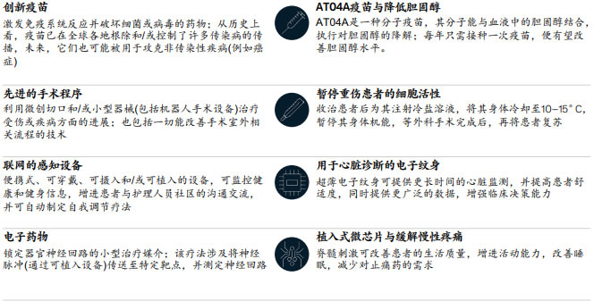 麥肯錫篩選了10項(xiàng)已經(jīng)展現(xiàn)出光明前景的重要技術(shù),到2040年,在已知干預(yù)措施減輕40%疾病負(fù)擔(dān)的基礎(chǔ)上,只要這些創(chuàng)新能得到積極而現(xiàn)實(shí)的采納,它們有望將疾病負(fù)擔(dān)進(jìn)一步降低6%~10%。其中一些創(chuàng)新不僅有望治愈某些疾病,改善患者治療后的生活質(zhì)量,而且有望解決衰老這一基本的生物學(xué)挑戰(zhàn),通過(guò)推遲與年齡有關(guān)的疾病的發(fā)病時(shí)間,它們有望顯著延長(zhǎng)健康壽命。其中包括細(xì)胞療法、再生醫(yī)療、數(shù)字療法和基因療法等。