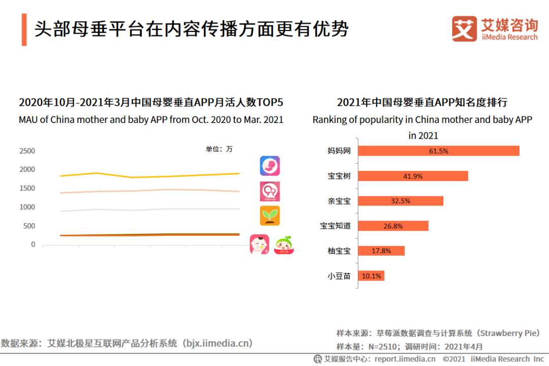數(shù)據(jù)顯示,目前中國母嬰垂直APP中,月活數(shù)量過千萬的平臺有兩家,分別是媽媽網(wǎng)和寶寶樹,其中媽媽網(wǎng)平均月活人數(shù)已迫近2000萬。艾媒咨詢分析師認為,互聯(lián)網(wǎng)社群交流已經(jīng)逐漸成為媽媽群體最為倚重的信息交流渠道之一,而頭部母嬰群體擁有大量的用戶基礎(chǔ)和品牌知名度,在社群傳播領(lǐng)域擁有較大的優(yōu)勢,能幫助平臺不斷拓新,形成良好的口碑效應(yīng)。