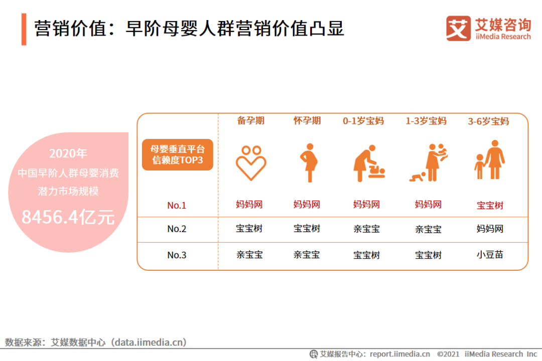 據(jù)iiMedia Research(艾媒咨詢)測算,2020年中國母嬰早階人群消費潛力市場規(guī)模超過8400億元,人群營銷價值逐漸凸顯,是母嬰品牌的主要藍海市場。對比其他母嬰垂直平臺App,媽媽網(wǎng)在早階人群使用率最高,艾媒咨詢分析師認為,母嬰品牌要有效獲得這一群體的關(guān)注,需要選擇媽媽網(wǎng)等TA(Target Audience)濃度最高平臺,精準觸達早階人群,以此提升品牌競爭力,推動品牌快速占據(jù)早階市場。