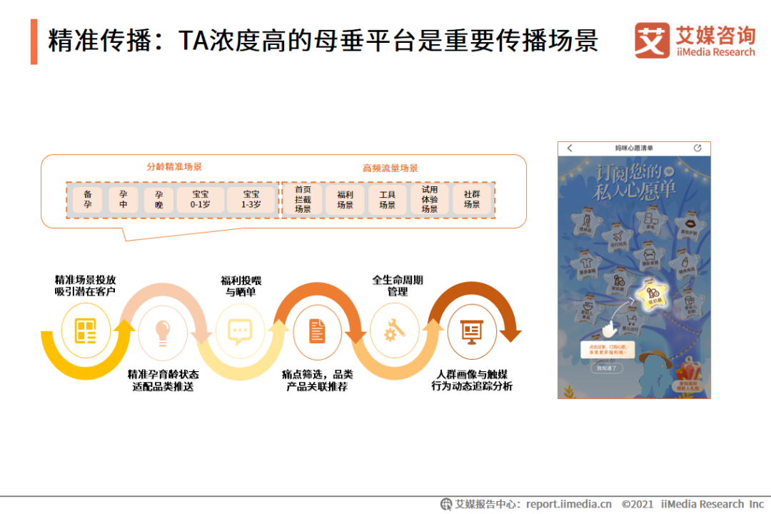 由于母嬰產(chǎn)品的選購時間有限,并且需要分階選品,因此抓住黃金時期的精準傳播,成為品牌制勝關(guān)鍵。艾媒咨詢分析師認為,從當(dāng)前的孕母資訊獲取及“種草”方式看,頭部母垂平臺的使用率明顯更高。以其中獨占率最高的媽媽網(wǎng)為例,可以通過分齡精準場景和高頻流量場景獲得精準用戶,并且通過用戶的全生育周期管理。實現(xiàn)分階段的精準信息傳遞。