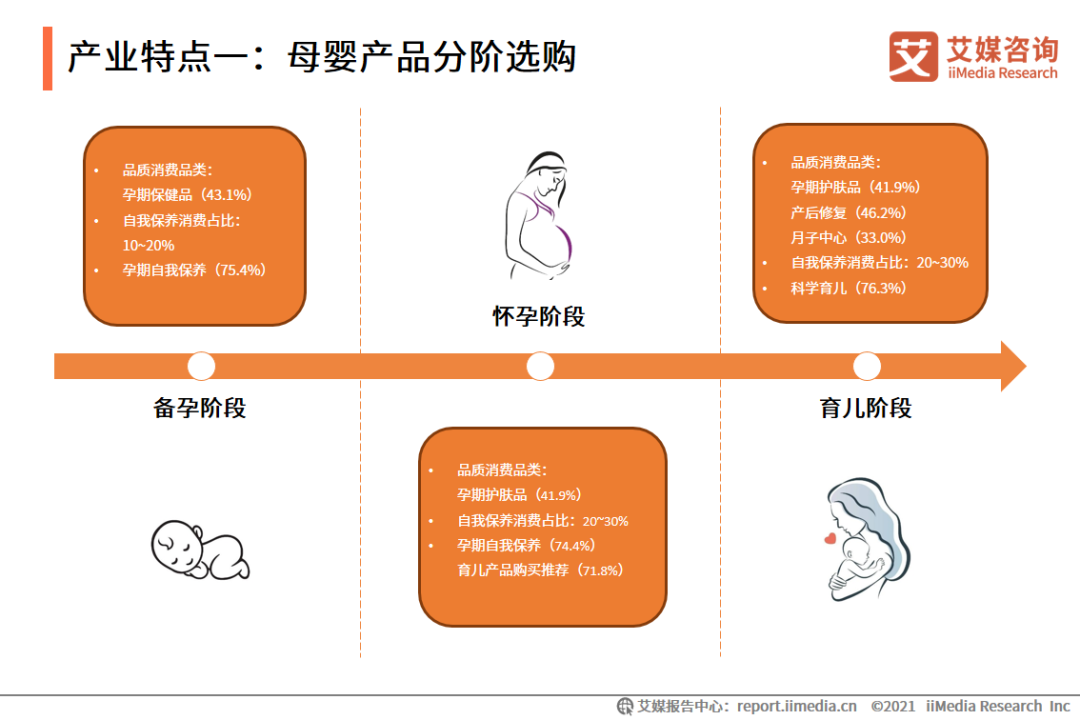 數(shù)據(jù)顯示,中國母嬰群體的消費選品期正在不斷提前,53%的受訪者表示從2年內(nèi)的備孕計劃期就開始會瀏覽相關(guān)資訊和選購產(chǎn)品,而在懷孕期購買母嬰產(chǎn)品的比例也達到41%。艾媒咨詢分析師認為,在母嬰群體的選品期前置影響下,母嬰消費的分階選品需求愈發(fā)明顯,消費市場向階段化、精細化發(fā)展。