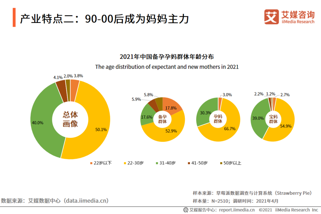 iiMedia Research(艾媒咨詢)調(diào)研數(shù)據(jù)顯示,年輕一代的中國女性群體已經(jīng)逐步進入備孕/懷孕年齡段,備孕群體中,90后(22-30歲)群體占比52.9%,而00后(22歲以下)群體占比為17.8%。換言之,當(dāng)前的孕媽群體主要以90-00年代為主,也逐步納入00后群體。