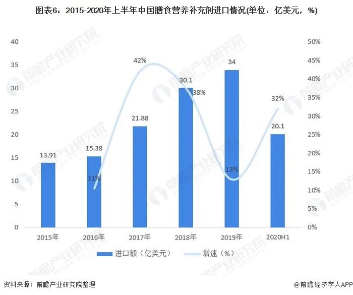 我國(guó)膳食營(yíng)養(yǎng)補(bǔ)充劑食用水平低于世界平均水平,在中國(guó),膳食營(yíng)養(yǎng)補(bǔ)充劑還是一個(gè)新興的行業(yè),導(dǎo)致我國(guó)膳食補(bǔ)充劑市場(chǎng)較為分散,故我國(guó)膳食營(yíng)養(yǎng)補(bǔ)充劑大量依靠進(jìn)口,2020年上半年進(jìn)口膳食補(bǔ)充劑貿(mào)易增幅大,我國(guó)膳食營(yíng)養(yǎng)補(bǔ)充劑作為新興行業(yè),尚處于起步發(fā)展階段,未來(lái)發(fā)展空間巨大。