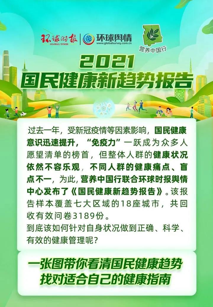 《2021國民健康新趨勢報告》由營養(yǎng)中國行與環(huán)球時報輿情中心聯(lián)合發(fā)布,覆蓋七大區(qū)域的18座城市,3189份樣本量,重點解讀全人群與特定人群健康趨勢。