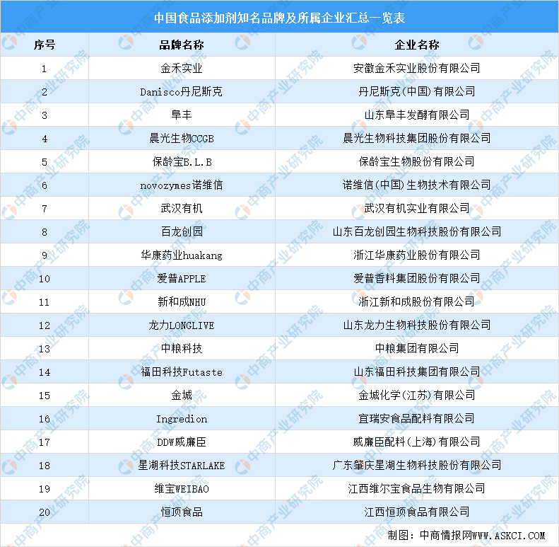 我國知名食品添加劑品牌有金禾實(shí)業(yè)、Danisco丹尼斯克、阜豐、晨光生物CCGB、保齡寶B.L.B、novozyaes諾維信、武漢有機(jī)、百龍創(chuàng)園等。下圖為我國食品添加劑知名品牌及所屬企業(yè)匯總一覽表: