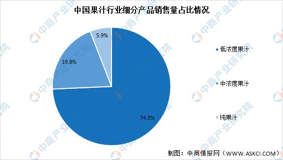 數(shù)據(jù)顯示,從零售市場結(jié)構(gòu)來看,低濃度果汁為市場消費(fèi)主流,低濃度果飲料零售量占果汁飲料總零售量的74.3%,中濃度果飲料零售量占果汁飲料總零售量的19.8%,純果汁零售量占果汁飲料總零售量的5.9%。