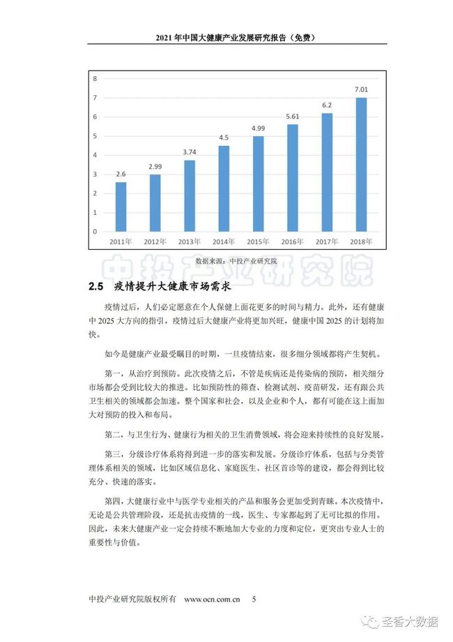 2019 年 12 月以來爆發(fā)的新冠病毒肺炎疫情引發(fā)全國上下對于大健康產(chǎn)業(yè)的高度關(guān)注,是一次史無前例的全民健康教育,國民有望持續(xù)增加健康消費支出。中國企業(yè)在新型冠狀病毒肺炎疫情中展示出了良好的社會擔當、快速的創(chuàng)新能力和在臨床一線發(fā)揮的積極作用,也將增強各方投資者對于大健康領(lǐng)域的投資信心。醫(yī)療健康是與這次疫情直接掛鉤的行業(yè),從診斷試劑盒、治療藥品、輔助治療器械,到口罩、防護服、護目鏡等醫(yī)護產(chǎn)品,再到后期提高身體免疫力的輔助保健品,整個產(chǎn)業(yè)鏈上的需求都將短期暴增。近年來,隨著產(chǎn)業(yè)規(guī)模快速增長和產(chǎn)業(yè)鏈持續(xù)延伸拓展,健康產(chǎn)業(yè)已成為世界許多國家特別是美歐發(fā)達國家和廣大新興市場國家有效應對金融危機沖擊、增強經(jīng)濟發(fā)展活力、滿足多樣化健康需求、加快搶占全球健康產(chǎn)業(yè)分工新制高點的戰(zhàn)略選擇。我國健康產(chǎn)業(yè)發(fā)展同樣處于重要戰(zhàn)略機遇期。伴隨我國經(jīng)濟持續(xù)快速發(fā)展,城鎮(zhèn)化進程加速,慢性病發(fā)病率不斷增長,人口老齡化程度日益加深,加之醫(yī)學技術(shù)進步,醫(yī)療與互聯(lián)網(wǎng)加速融合,我國人民群眾健康消費需求持續(xù)釋放,健康產(chǎn)業(yè)規(guī)模不斷增長,大健康產(chǎn)業(yè)駛?cè)敫咚侔l(fā)展的快車道。我國大健康產(chǎn)業(yè)市場規(guī)模由2010年的19308億元,上升至 2016 年的 56073 億元,增長了近 2 倍。2017 年我國大健康產(chǎn)業(yè)規(guī)模達 6.2 萬億元,2011-2017 年復合增長率達 15.6%。初步測算 2018 年我國大健康產(chǎn)業(yè)規(guī)模突破 7萬億元。