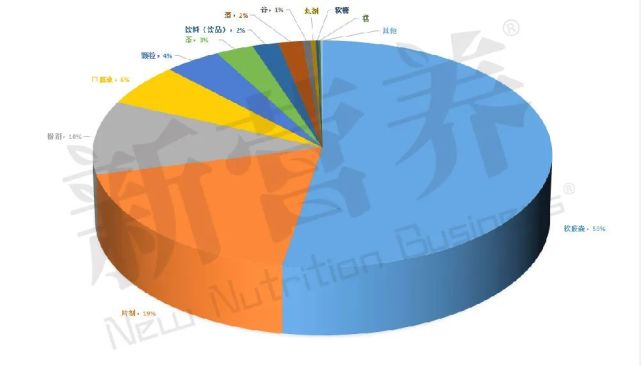從產品劑型上看,保健食品的劑型種類較多,包括常見的軟膠囊、片劑、粉劑、顆粒劑、口服液等,以及食品形態(tài)的飲料、酒劑、茶劑、凝膠糖果等。其中,軟膠囊類產品的獲批數(shù)量最多,為1225款,占保健食品備案及注冊總量的53%;此外,片劑、粉劑、口服液類產品的獲批數(shù)量較多,分別為432款、245款和141款,分別占保健食品注冊總量的18%、10%和6%。