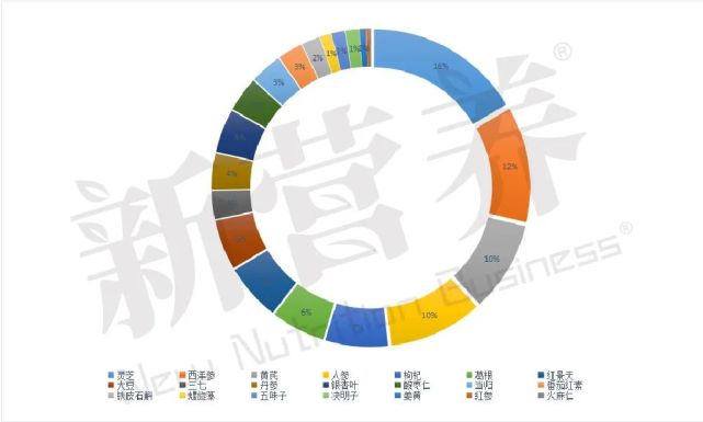 其中,在植物性營養(yǎng)素類別中,靈芝(含靈芝孢子,16%)、西洋參、黃芪(10%)、枸杞(7%)等傳統(tǒng)中藥類原料居多;葛根、紅景天、三七等藥食同源的中藥材也也常被添加在保健食品中。