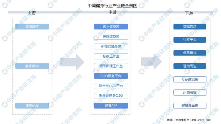 健身行業(yè)上游包括健身器材、教練培訓(xùn)、課程研發(fā);中游包括線下健身房、O2O服務(wù)平臺、健身APP,覆蓋線上線下各類健身場景;下游包括數(shù)據(jù)管理、社交平臺、信息查找、運動周邊,滿足消費者不同衍生需求。