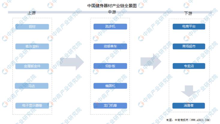 健身器材上游為各類原材料,包括鋼材、橡膠塑料、金屬鈑金件、馬達(dá)、電子顯示器等;中游為各類健身器材,包括跑步機(jī)、動(dòng)感單車、仰臥板、橢圓機(jī)、龍門機(jī)等;下游為各類銷售平臺(tái),最終到終端消費(fèi)者。