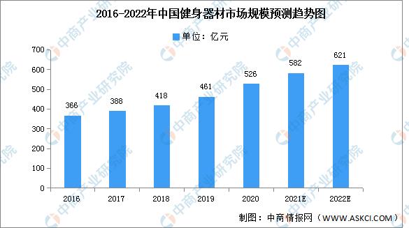 隨著我國健身相關(guān)政策的推行,國民健身意識(shí)不斷增強(qiáng)。近年來,中國健身器材市場規(guī)模保持增長趨勢,從2016年的366億元增長至2020年的526億元,年均復(fù)合增長率達(dá)9.49%,預(yù)計(jì)2022年將進(jìn)一步增長至621億元。