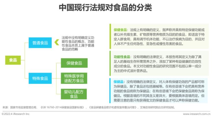 中國(guó)現(xiàn)行法律法規(guī)將食品劃分為普通食品和特殊食品兩大類,其中特殊食品包含保健食品、特殊醫(yī)學(xué)用途配方食品、嬰幼兒配方食品。中國(guó)目前并沒(méi)有關(guān)于功能性食品的官方定義,其本質(zhì)上仍是普通食品,按照普通食品的法規(guī)來(lái)監(jiān)管。