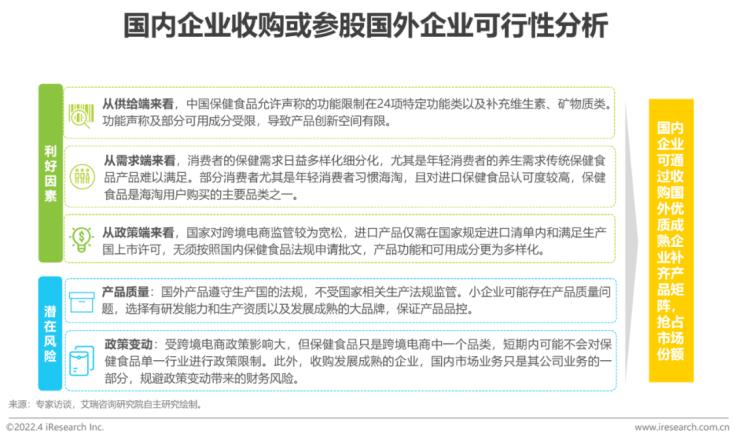 目前中國(guó)對(duì)跨境電商監(jiān)管較為寬松,進(jìn)口產(chǎn)品僅需在國(guó)家規(guī)定進(jìn)口清單內(nèi)和滿足生產(chǎn)國(guó)上市許可,即可向國(guó)內(nèi)消費(fèi)者展開(kāi)零售,無(wú)需按照國(guó)內(nèi)監(jiān)管獲得注冊(cè)證書(shū)或備案憑證。在國(guó)內(nèi)保健食品產(chǎn)品功能聲稱及產(chǎn)品創(chuàng)新受限,同時(shí)消費(fèi)者保健需求日益細(xì)分化多樣化的情況下,一些國(guó)內(nèi)無(wú)法申請(qǐng)的產(chǎn)品功能可以通過(guò)收購(gòu)國(guó)外優(yōu)質(zhì)企業(yè)補(bǔ)充產(chǎn)品矩陣,搶占市場(chǎng)份額。