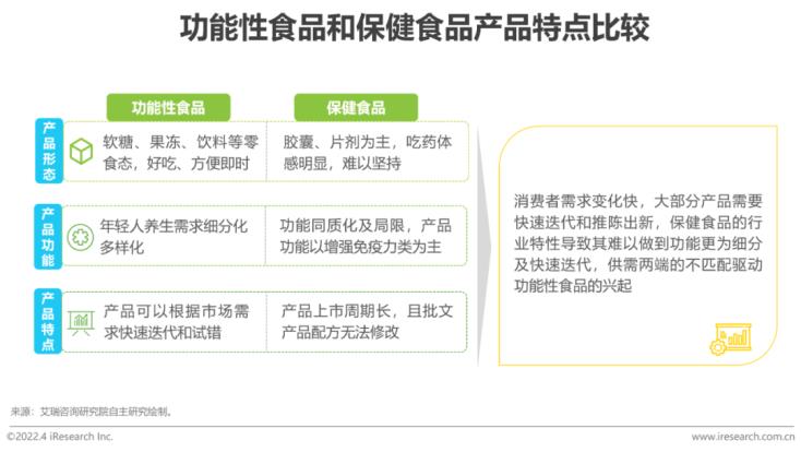 保健食品的功能局限在24項(xiàng)功能及補(bǔ)充維生素、礦物質(zhì)類,且已獲得批文的產(chǎn)品功能偏向滿足中老年人的需求,年輕人的美容、腸胃健康、助眠等更多細(xì)分化功能需求難以滿足。隨著年輕人越來(lái)越注重養(yǎng)生,在供需不匹配的市場(chǎng)背景下催生了功能性食品的興起,功能性食品作為普通食品在產(chǎn)品形態(tài)等方面創(chuàng)新空間更大。