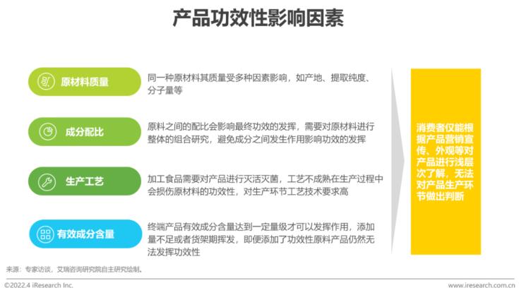 產(chǎn)品功效受原材料質(zhì)量、成分配比、生產(chǎn)工藝及有效成分含量等多重因素影響,目前國(guó)家層面對(duì)功能性食品暫未有產(chǎn)品監(jiān)管和認(rèn)證標(biāo)準(zhǔn),而消費(fèi)者端僅能根據(jù)產(chǎn)品宣傳對(duì)產(chǎn)品配方、外觀等進(jìn)行淺層次判斷。市面上部分產(chǎn)品存在概念性添加的問(wèn)題,部分企業(yè)的產(chǎn)品質(zhì)量問(wèn)題,會(huì)影響整個(gè)行業(yè)的聲譽(yù)和消費(fèi)者的信任。