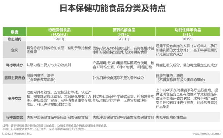 根據(jù)日本消費(fèi)者事務(wù)廳的定義,食品分為一般食品和保健功能食品兩類。其中,保健功能食品分為特定保健食品、營(yíng)養(yǎng)機(jī)能食品和功能性標(biāo)示食品三類。特定保健用食品于1991年引入,實(shí)行審批制,進(jìn)入門(mén)檻高;營(yíng)養(yǎng)機(jī)能食品于2001年引入,產(chǎn)品成分及用量需使用經(jīng)過(guò)科學(xué)認(rèn)證的營(yíng)養(yǎng)成分,產(chǎn)品可以直接上市銷售;功能性標(biāo)示食品于2015年引入,上市前60天企業(yè)向消費(fèi)者事務(wù)廳備案即可。以上三種食品獲批后均可對(duì)批準(zhǔn)的功能進(jìn)行標(biāo)示。