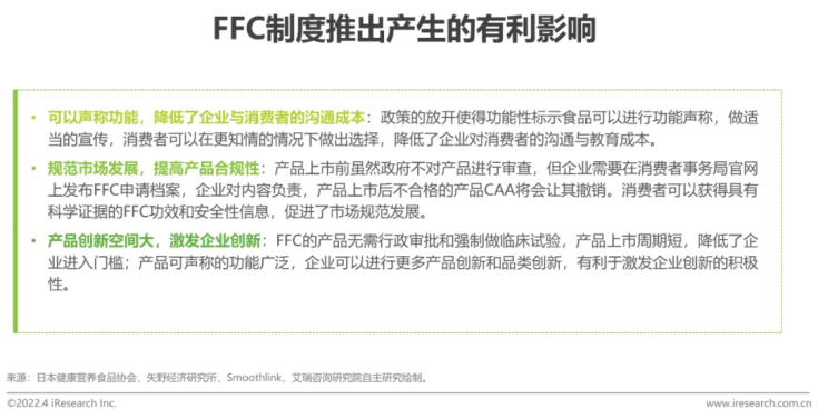 在日本人口老齡化日益嚴(yán)重及經(jīng)濟(jì)低迷、FOSHU市場(chǎng)增幅放緩的背景下,政府認(rèn)為生產(chǎn)和銷售更多的保健食品有利于振興經(jīng)濟(jì),從而催生了FFC制度,一方面可以刺激經(jīng)濟(jì)增長(zhǎng),同時(shí)也可以提高國(guó)民身體健康水平。