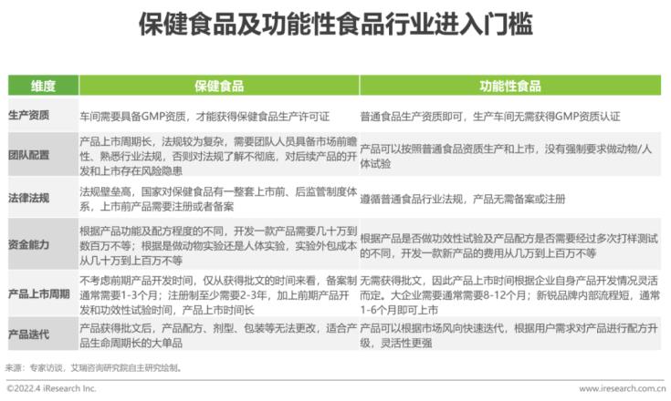 行業(yè)進(jìn)入門(mén)檻:保健食品對(duì)企業(yè)的法規(guī)資質(zhì)、研發(fā)能力和資金實(shí)力要求高;功能性食品進(jìn)入門(mén)檻低,發(fā)展更為靈活。