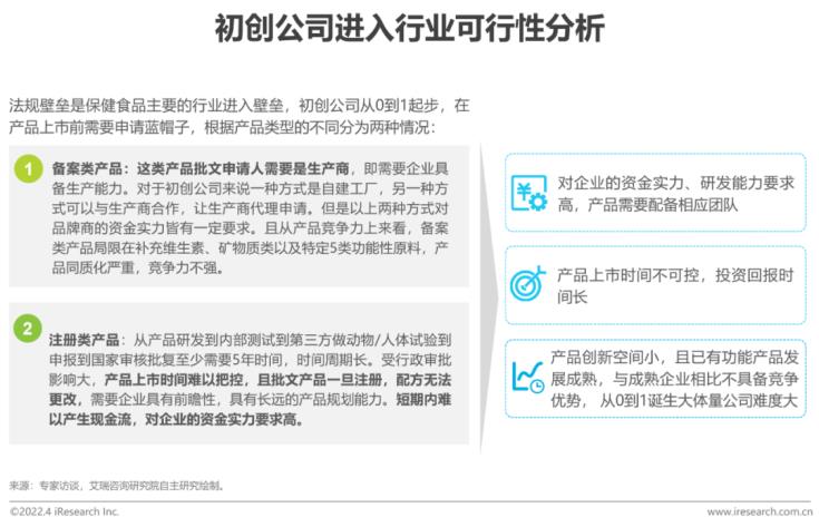 保健食品行業(yè)法規(guī)壁壘高,對(duì)于初創(chuàng)公司來(lái)說(shuō),從0開(kāi)始搭建團(tuán)隊(duì)進(jìn)入市場(chǎng),時(shí)間成本、資金成本要求高,且已有功能產(chǎn)品發(fā)展成熟,產(chǎn)品創(chuàng)新空間有限,與大企業(yè)比不具有差異化及競(jìng)爭(zhēng)優(yōu)勢(shì),對(duì)于初創(chuàng)公司來(lái)說(shuō),跑出大體量公司的難度大。