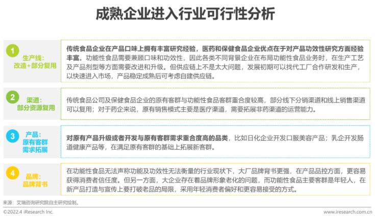 根據(jù)企業(yè)原有基因不同,成熟企業(yè)在生產(chǎn)線、渠道、客群等方面部分資源可以復(fù)用。在功能性食品無(wú)法聲稱功能及功效性無(wú)法衡量的行業(yè)現(xiàn)狀下,大廠品牌背書(shū)性更強(qiáng),更容易獲得消費(fèi)者信任。但另一方面成熟企業(yè)可能存在品牌老化問(wèn)題,在新產(chǎn)品打造與宣傳上要打破老品的局限,采用年輕消費(fèi)者偏好和容易接受的方式。