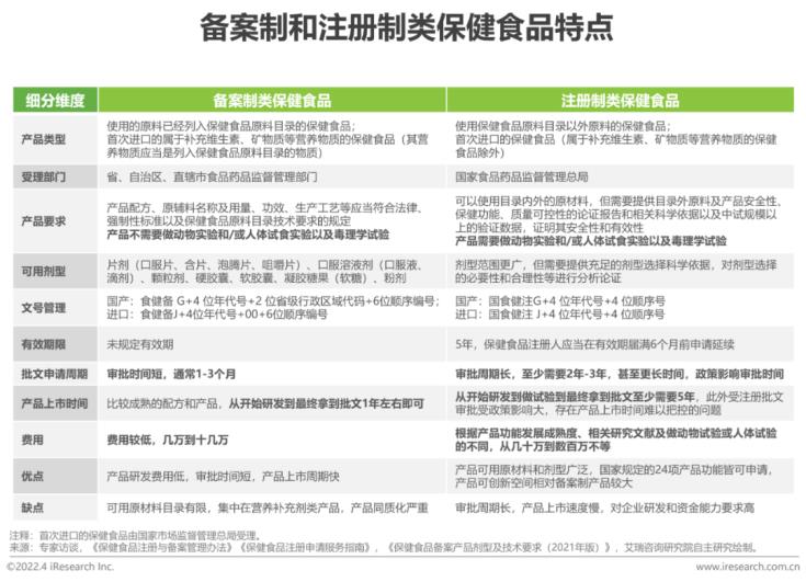 管理模式:備案制產(chǎn)品進(jìn)入門(mén)檻低,上市周期快,但產(chǎn)品可用原材料和功能聲稱較窄,產(chǎn)品同質(zhì)化嚴(yán)重;注冊(cè)制產(chǎn)品從可用原材料和功能聲稱上更為寬泛,但是需要進(jìn)行系統(tǒng)評(píng)審,批文受行政審批影響大,產(chǎn)品上市時(shí)間難以把控。