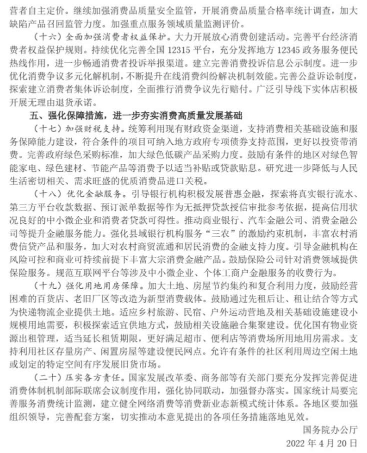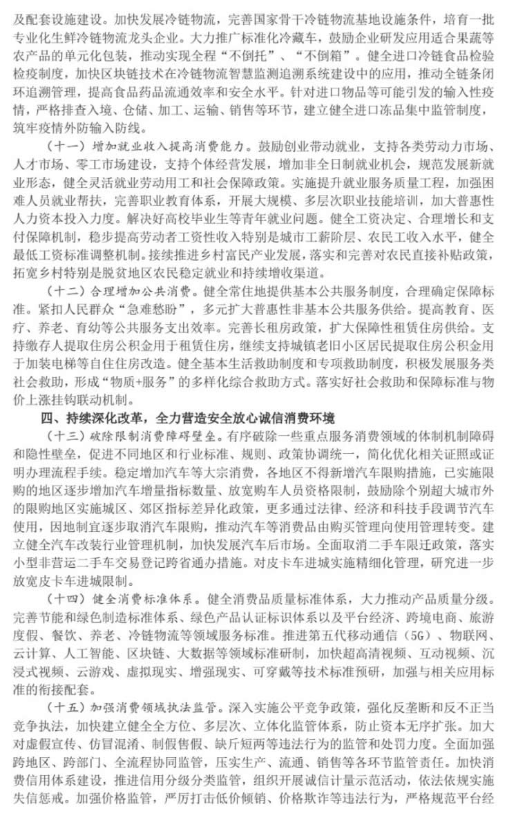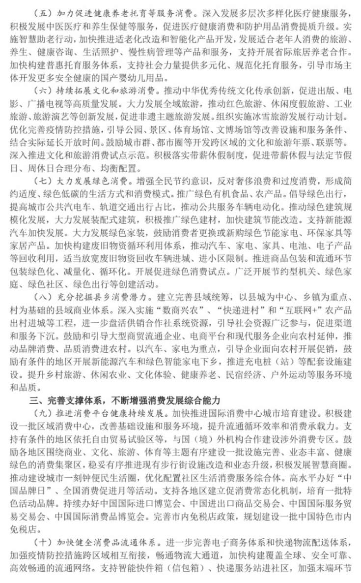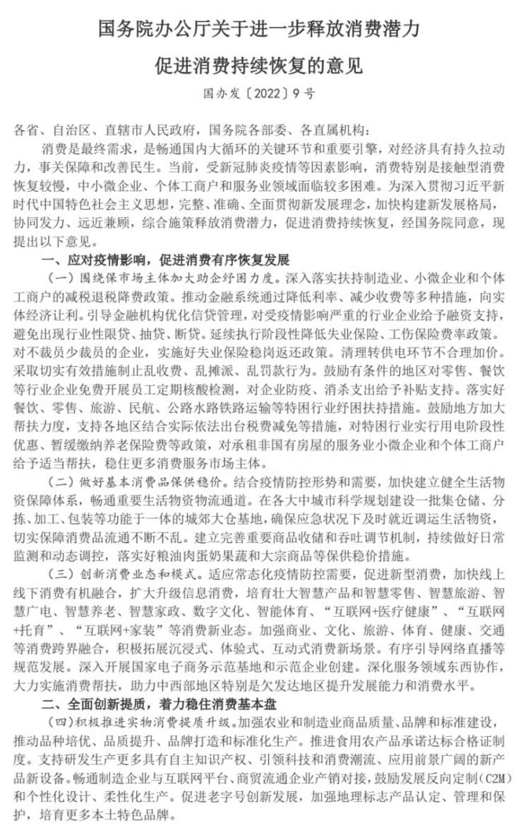 消費(fèi)是最終需求,是暢通國內(nèi)大循環(huán)的關(guān)鍵環(huán)節(jié)和重要引擎,對(duì)經(jīng)濟(jì)具有持久拉動(dòng)力,事關(guān)保障和改善民生。當(dāng)前,受新冠肺炎疫情等因素影響,消費(fèi)特別是接觸型消費(fèi)恢復(fù)較慢,中小微企業(yè)、個(gè)體工商戶和服務(wù)業(yè)領(lǐng)域面臨較多困難。為深入貫徹習(xí)近平新時(shí)代中國特色社會(huì)主義思想,完整、準(zhǔn)確、全面貫徹新發(fā)展理念,加快構(gòu)建新發(fā)展格局,協(xié)同發(fā)力、遠(yuǎn)近兼顧,綜合施策釋放消費(fèi)潛力,促進(jìn)消費(fèi)持續(xù)恢復(fù),經(jīng)國務(wù)院同意,現(xiàn)提出以下意見。