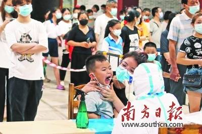 在海珠區(qū)赤崗街客村禮堂,居民正在測核酸。南方日?qǐng)?bào)記者 符超軍 攝