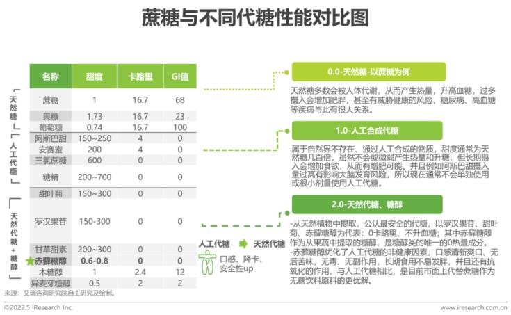 代糖本質(zhì)并不是糖,但可以和糖一樣幫助食物產(chǎn)生甜味,也稱(chēng)其為甜味劑。與糖最大的區(qū)別在于代糖幾乎不參與代謝、不產(chǎn)生熱量、不升高血糖。代糖主要分為人工代糖和天然代糖兩大類(lèi),此處主要以蔗糖為參考標(biāo)準(zhǔn),對(duì)比人工代糖和天然代糖的特點(diǎn),表中可看出大部分代糖都可以做到零GI值以及不產(chǎn)生熱量(阿斯巴甜和安賽蜜產(chǎn)生微量卡路里),但是人工代糖有可能存在影響健康安全的危險(xiǎn),而天然代糖尤其是糖醇類(lèi)的赤蘚糖醇可以做到零GI值和零卡路里,長(zhǎng)期食用不會(huì)發(fā)胖、口感還原度高、不會(huì)威脅大腦神經(jīng)發(fā)育,食作為目前食品飲料甜味來(lái)源廣泛應(yīng)用的優(yōu)秀選手。
