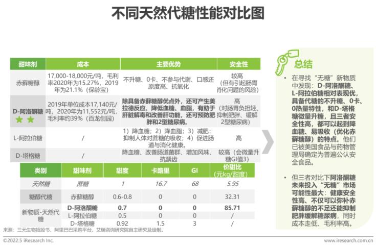 上文可以發(fā)現(xiàn)赤蘚糖醇是眾多現(xiàn)有代糖中的相對(duì)最優(yōu)解,但是作為糖醇類(lèi)的一種存在天然缺陷,長(zhǎng)期使用對(duì)腸胃耐受能力弱的人會(huì)形成消化負(fù)擔(dān),引起脹氣或腹鳴,并且作為當(dāng)前市場(chǎng)最火爆原料,需求暴漲的局勢(shì)下,其單位成本也有所上漲。所以科學(xué)家、原料生產(chǎn)商也在不停探索更優(yōu)解,希望找到量?jī)r(jià)、屬性等各方面更優(yōu)秀的原料成分,優(yōu)化赤蘚糖醇不足同時(shí)給予市場(chǎng)更多發(fā)展空間。我們對(duì)相關(guān)學(xué)術(shù)文章、科研成果進(jìn)行研究發(fā)現(xiàn)阿洛酮糖、阿拉伯糖和塔格糖性能表現(xiàn)更優(yōu),其中阿洛酮糖綜合各方優(yōu)勢(shì)最有可能成為代糖物質(zhì)更優(yōu)解落地應(yīng)用。