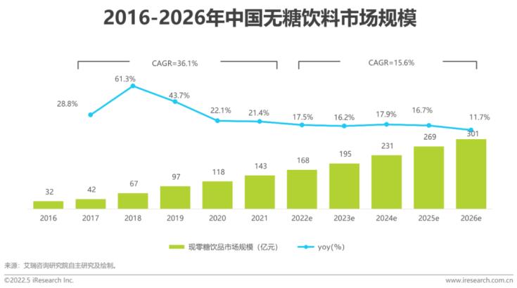 2026年預(yù)計(jì)該市場(chǎng)可達(dá)301億元,約為2021年的一倍之多,2022年至2026年CAGR為15.6%(增速相對(duì)放緩),相比前五年,屬于穩(wěn)定較高速發(fā)展期,該階段下民眾對(duì)無(wú)糖飲料的接納從初期的新品嘗鮮轉(zhuǎn)化為日常消費(fèi),從爆發(fā)期的集中囤貨轉(zhuǎn)為穩(wěn)定頻次購(gòu)買(mǎi)。