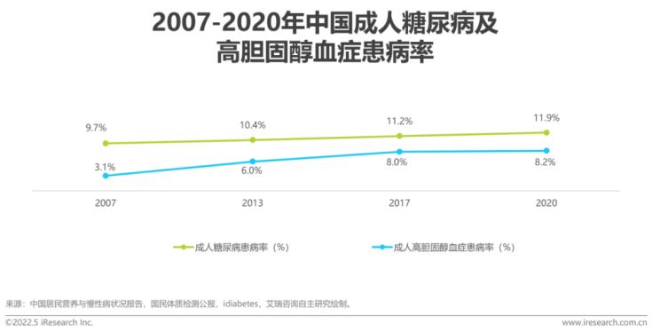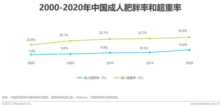 根據(jù)我國(guó)《國(guó)民檢測(cè)公報(bào)》可知,占人口基數(shù)最多的18歲以上成年人群體2020年超重或肥胖率已經(jīng)超過(guò)一半(50.7%);呈逐年增加趨勢(shì),2000年到2020年超重率從22.8%提升到35%,20年間超重人群占比增加12.2%;肥胖率2020年相比2000年以一倍速度增加(從7%增加至14.6%)。同時(shí)據(jù)《中國(guó)居民營(yíng)養(yǎng)與慢性病狀況報(bào)告》發(fā)現(xiàn)過(guò)去近15年中成人(患病主流人群)糖尿病患病率從9.7%增加到11.9%,新增患病人數(shù)超過(guò)5000萬(wàn)人。