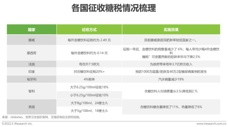 糖、脂、油等高攝入是引發(fā)糖尿病、高膽固醇血癥等相關(guān)疾病的重要原因之一,過(guò)量糖攝入帶來(lái)的危害已經(jīng)嚴(yán)重威脅居民身體健康。WHO建議,如果對(duì)含糖飲料征稅使零售價(jià)提高至少20%,相關(guān)產(chǎn)品消費(fèi)量就會(huì)相應(yīng)減少,從而總體降低“游離糖”和熱量的攝入,可以改善營(yíng)養(yǎng),減少肥胖、糖尿病和齲齒等疾病患病人數(shù)。