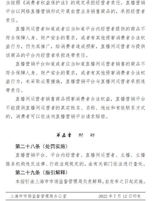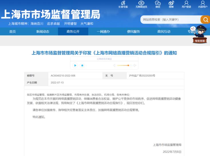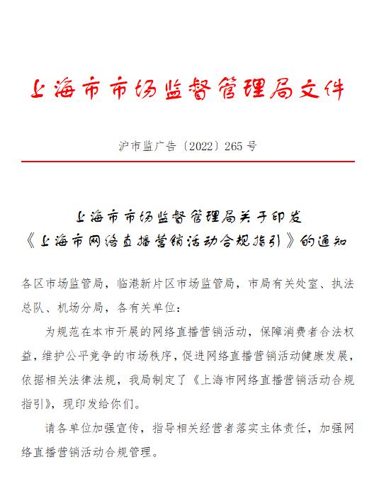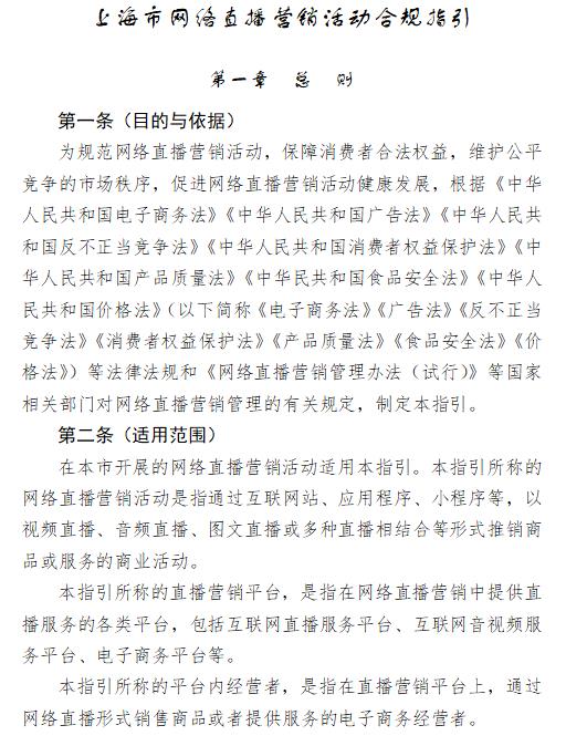 日前,上海市市場(chǎng)監(jiān)管局發(fā)布《上海市網(wǎng)絡(luò)直播營(yíng)銷活動(dòng)合規(guī)指引》(以下簡(jiǎn)稱“《指引》”),旨在規(guī)范網(wǎng)絡(luò)直播營(yíng)銷活動(dòng),保障消費(fèi)者合法權(quán)益,維護(hù)公平競(jìng)爭(zhēng)的市場(chǎng)秩序,促進(jìn)網(wǎng)絡(luò)直播營(yíng)銷活動(dòng)健康發(fā)展。