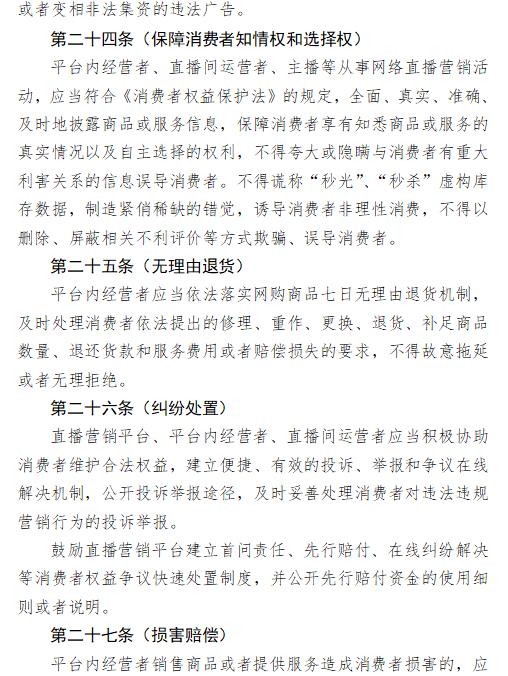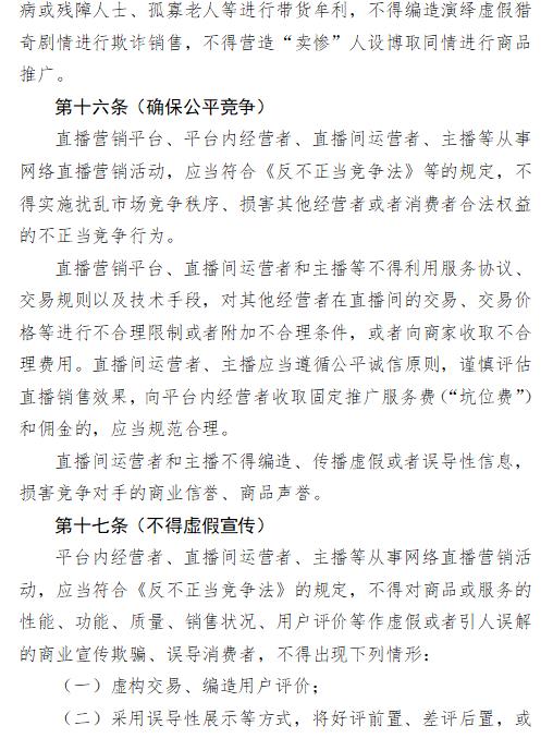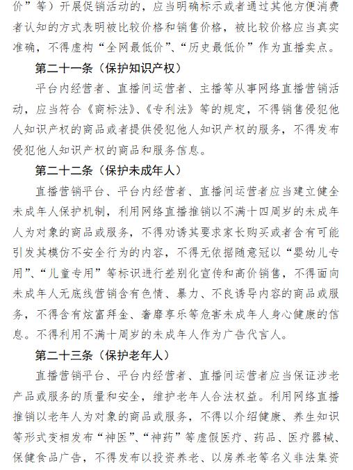 直播營(yíng)銷平臺(tái)、平臺(tái)內(nèi)經(jīng)營(yíng)者、直播間運(yùn)營(yíng)者應(yīng)當(dāng)保證涉老產(chǎn)品或服務(wù)的質(zhì)量和安全,維護(hù)老年人合法權(quán)益。利用網(wǎng)絡(luò)直播推銷以老年人為對(duì)象的商品或服務(wù),不得以介紹健康、養(yǎng)生知識(shí)等形式變相發(fā)布“神醫(yī)”、“神藥”等虛假醫(yī)療、藥品、醫(yī)療器械、保健食品廣告,不得發(fā)布以投資養(yǎng)老、以房養(yǎng)老等名義非法集資或者變相非法集資的違法廣告。