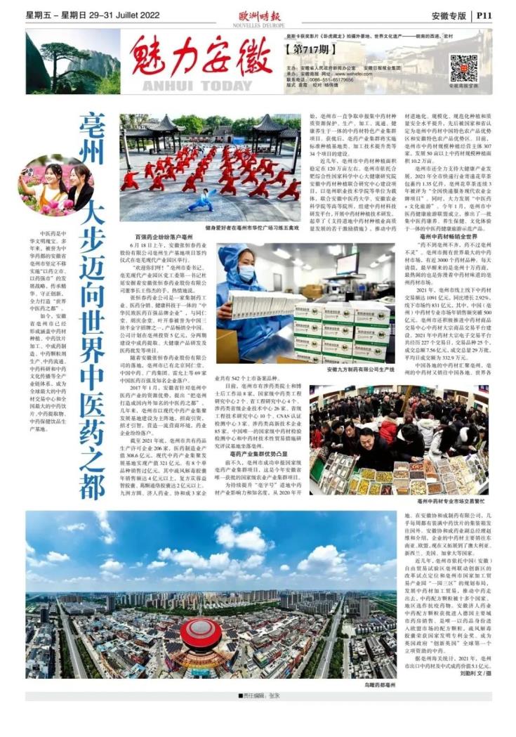 法國(guó)《歐洲時(shí)報(bào)》“魅力安徽”7月29日在法國(guó)巴黎刊發(fā),專(zhuān)題報(bào)道:《亳州 大步邁向世界中醫(yī)藥之都》,法國(guó)《歐洲時(shí)報(bào)》官網(wǎng)歐洲網(wǎng)同步線上發(fā)布;