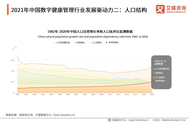數(shù)據(jù)顯示,從1982年開始中國人口自然增長率整體遞減,2020年增長率僅約1.5% 。而中國總人口撫養(yǎng)比卻在不斷提升,2020年總撫養(yǎng)比高達45.9%,其中老年撫養(yǎng)比為19.7%,少兒撫養(yǎng)比約為26.2%。2020年,我國60歲及以上人口占比超18.7%,中國已經進入深度老齡化社會。