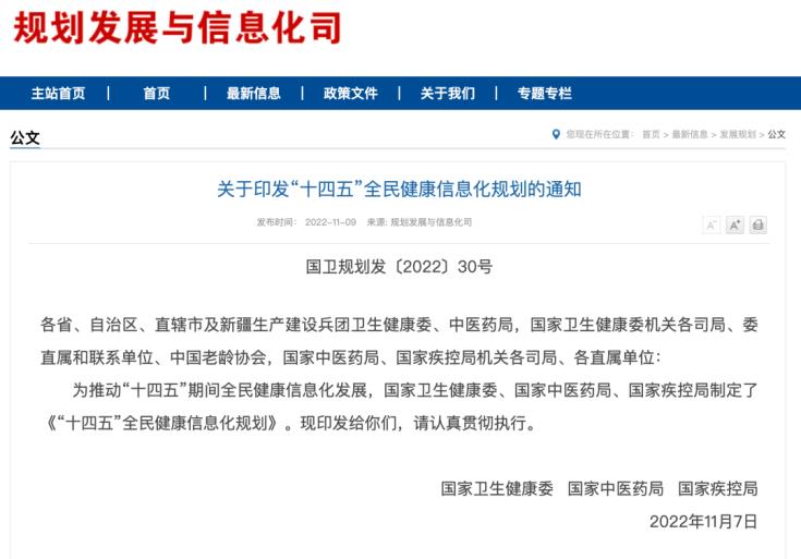 2022年11月9日,國(guó)家衛(wèi)生健康委、國(guó)家中醫(yī)藥局、國(guó)家疾控局對(duì)外發(fā)布《“十四五”全民健康信息化規(guī)劃》。