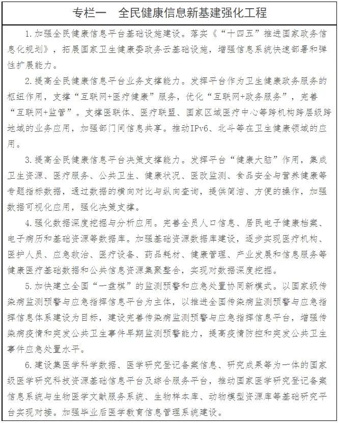 包括8個(gè)方面主要任務(wù)。一是集約建設(shè)信息化基礎(chǔ)設(shè)施支撐體系。二是健全全民健康信息化標(biāo)準(zhǔn)體系。三是深化“互聯(lián)網(wǎng)+醫(yī)療健康”服務(wù)體系。四是完善健康醫(yī)療大數(shù)據(jù)資源要素體系。五是推進(jìn)數(shù)字健康融合創(chuàng)新發(fā)展體系。六是拓展基層信息化保障服務(wù)體系。七是強(qiáng)化衛(wèi)生健康統(tǒng)計(jì)調(diào)查分析應(yīng)用體系。八是夯實(shí)網(wǎng)絡(luò)與數(shù)據(jù)安全保障體系。