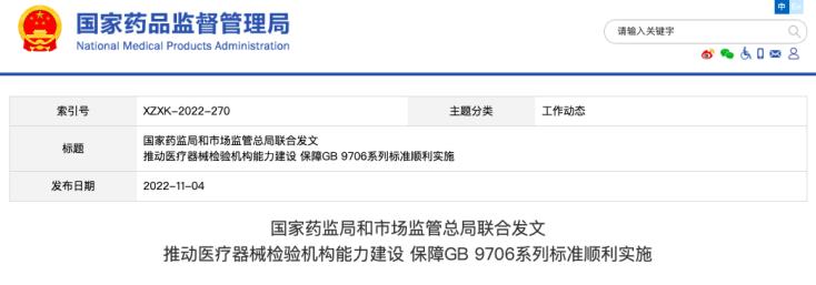 2022年11月4日,國(guó)家藥監(jiān)局和市場(chǎng)監(jiān)管總局聯(lián)合發(fā)文推動(dòng)醫(yī)療器械檢驗(yàn)機(jī)構(gòu)能力建設(shè) 保障GB 9706系列標(biāo)準(zhǔn)順利實(shí)施。