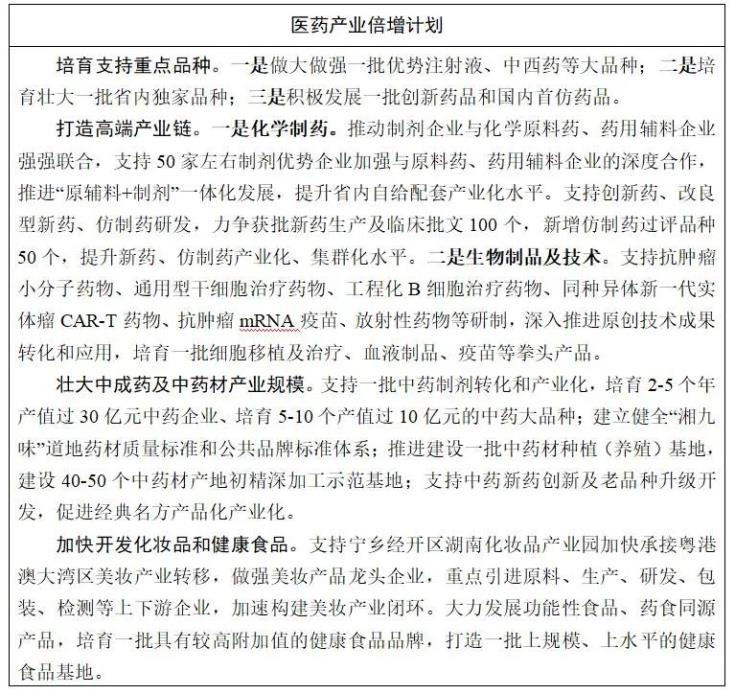 (一)大力發(fā)展醫(yī)藥及美妝、健康食品產(chǎn)業(yè)。聚焦具有創(chuàng)新性、獨(dú)特性、成長性、進(jìn)口替代性,以及關(guān)鍵技術(shù)領(lǐng)先、市場需求大、發(fā)展基礎(chǔ)較好的省產(chǎn)醫(yī)藥品種(制劑),遴選認(rèn)定一批生物醫(yī)藥產(chǎn)業(yè)鏈重點(diǎn)品種,集中培育支持。推動化學(xué)藥、生物制品及技術(shù)等重點(diǎn)產(chǎn)業(yè)領(lǐng)域鏈?zhǔn)桨l(fā)展,形成產(chǎn)業(yè)集群;提升“湘九味”品牌,壯大“湘九味”道地藥材等特色藥材產(chǎn)業(yè)及深加工規(guī)模;加快推進(jìn)促進(jìn)干細(xì)胞修復(fù)的新型中藥研發(fā),培育新型中藥產(chǎn)業(yè);加快承接化妝品產(chǎn)業(yè)轉(zhuǎn)移,壯大美妝產(chǎn)業(yè)規(guī)模。加快發(fā)展嬰幼兒、老年和特定人群功能性食品,鼓勵本土優(yōu)勢企業(yè)研究開發(fā)保健和健康食品。(牽頭單位:省工業(yè)和信息化廳、省藥監(jiān)局;責(zé)任單位:省中醫(yī)藥局、省科技廳、省農(nóng)業(yè)農(nóng)村廳、省林業(yè)局、省醫(yī)保局、省國資委,市州人民政府)