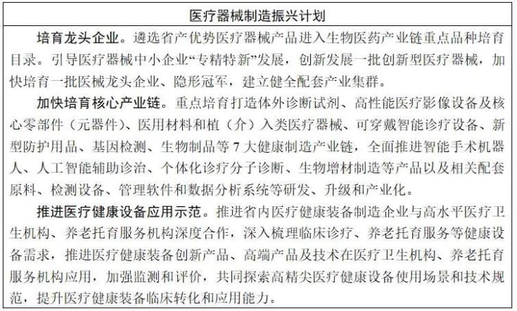 (三)推動醫(yī)療器械及健康裝備制造振興發(fā)展。適應(yīng)全省人民群眾健康消費(fèi)升級,加快體外診斷產(chǎn)品、高性能診療設(shè)備及核心零部件(元器件)、醫(yī)用材料和植(介)入類醫(yī)療器械、可穿戴智能設(shè)備、基因檢測、新型防護(hù)用品等領(lǐng)域產(chǎn)品開發(fā)與產(chǎn)業(yè)化,推動醫(yī)療器械跨領(lǐng)域融合,推進(jìn)高端化、集聚化、國際化發(fā)展,壯大產(chǎn)業(yè)規(guī)模,基本實(shí)現(xiàn)主流醫(yī)療裝備有效供給,提升高端醫(yī)療裝備產(chǎn)品性能和質(zhì)量水平,形成對醫(yī)療健康需求和大健康產(chǎn)業(yè)發(fā)展的支撐能力。(牽頭單位:省工業(yè)和信息化廳、省藥監(jiān)局;責(zé)任單位:省衛(wèi)生健康委、省發(fā)展改革委、省科技廳、省民政廳,市州人民政府)