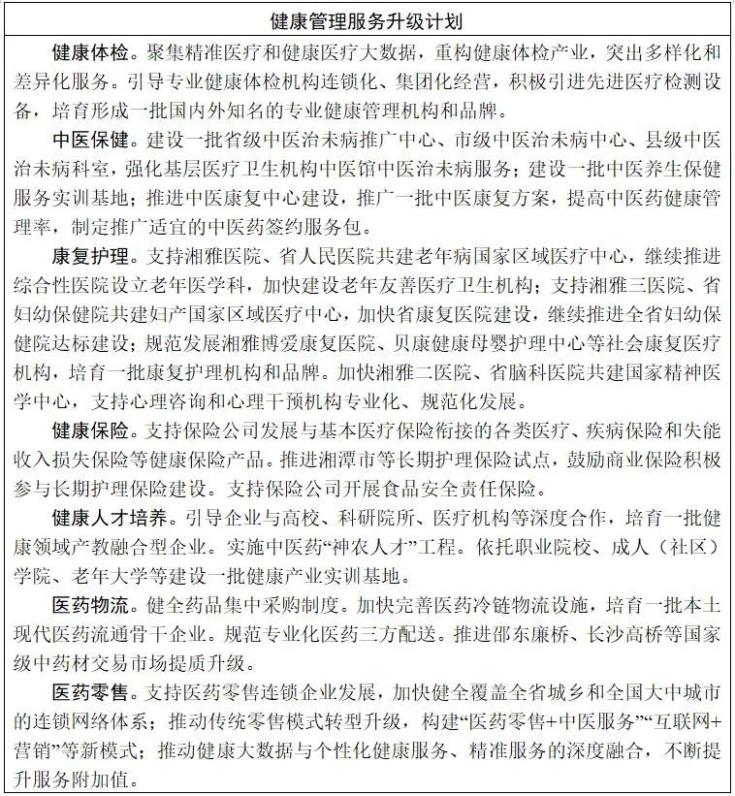 (四)推動健康管理服務(wù)升級。鼓勵公立醫(yī)院與社會資本合作開展健康管理服務(wù),發(fā)展以健康風(fēng)險管理為核心的健康管理新型組織。提升省、市、縣三級中醫(yī)藥治未病、中醫(yī)藥康復(fù)服務(wù)能力。創(chuàng)新慢病康復(fù)療養(yǎng)、健康跟蹤管理和孕產(chǎn)婦、嬰幼兒健康護(hù)理,加強(qiáng)特殊群體心理健康服務(wù)。促進(jìn)商業(yè)健康保險與基本醫(yī)?;パa(bǔ)銜接,推進(jìn)長期護(hù)理保險試點(diǎn)。推動健康產(chǎn)業(yè)實(shí)用技術(shù)技能人才產(chǎn)教融合實(shí)訓(xùn)基地建設(shè)。加強(qiáng)現(xiàn)代藥品流通網(wǎng)絡(luò)建設(shè)。(牽頭單位:省衛(wèi)生健康委;責(zé)任單位:省民政廳、省中醫(yī)藥局、湖南銀保監(jiān)局、省地方金融監(jiān)管局、省發(fā)展改革委、省人力資源社會保障廳、省教育廳、省市場監(jiān)管局、省藥監(jiān)局,市州人民政府)