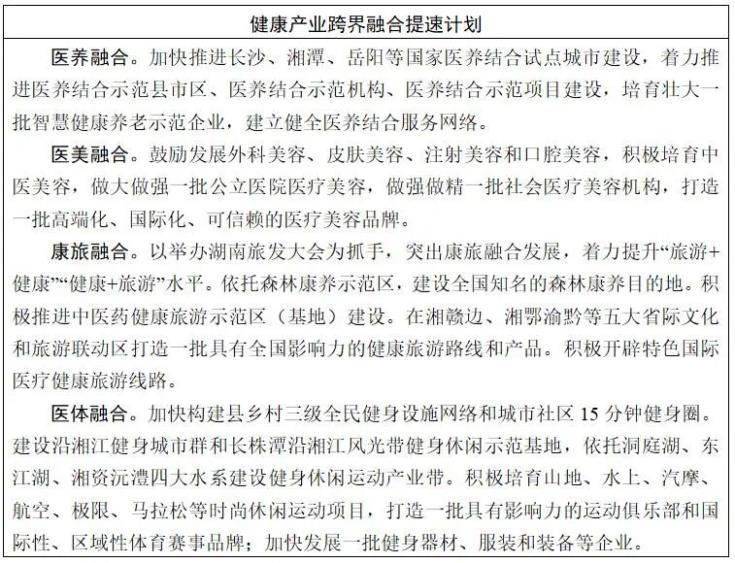 (五)推動健康產(chǎn)業(yè)跨界融合提速。實(shí)施醫(yī)養(yǎng)結(jié)合示范工程和社區(qū)醫(yī)養(yǎng)結(jié)合能力提升工程,積極推進(jìn)智慧康養(yǎng)應(yīng)用試點(diǎn)示范。著力發(fā)展醫(yī)療美容服務(wù)業(yè),完善醫(yī)療美容服務(wù)體系。鼓勵優(yōu)質(zhì)醫(yī)療機(jī)構(gòu)、旅游服務(wù)機(jī)構(gòu)和旅游休閑基地深度合作,積極建設(shè)國家中醫(yī)藥健康旅游示范區(qū)(基地)。依托豐富旅游資源和特色自然生態(tài)資源,實(shí)施“森林康養(yǎng)+”行動,推動康旅康養(yǎng)融合。圍繞慢性病預(yù)防、運(yùn)動康復(fù)、健康促進(jìn)等,深入推動醫(yī)體融合。(牽頭單位:省衛(wèi)生健康委;責(zé)任單位:省民政廳、省文化和旅游廳、省中醫(yī)藥局、省體育局、省藥監(jiān)局、省林業(yè)局,市州人民政府)