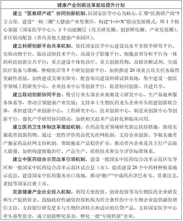(六)推動健康產(chǎn)業(yè)創(chuàng)新改革能級提升。順應(yīng)大健康產(chǎn)業(yè)創(chuàng)新升級發(fā)展趨勢,加快前沿共性技術(shù)創(chuàng)新研發(fā)與臨床應(yīng)用。集中布局建設(shè)一批醫(yī)學(xué)領(lǐng)域關(guān)鍵技術(shù)攻關(guān)、創(chuàng)新成果轉(zhuǎn)化、公共技術(shù)服務(wù)和資源共享平臺,推動醫(yī)學(xué)科研成果及時孵化、轉(zhuǎn)化和產(chǎn)業(yè)化。深化健康產(chǎn)業(yè)發(fā)展體制機(jī)制改革和政策創(chuàng)新。(牽頭單位:省衛(wèi)生健康委;責(zé)任單位:省發(fā)展改革委、省教育廳、省科技廳、省財(cái)政廳、省商務(wù)廳、省國資委、省地方金融監(jiān)管局、省醫(yī)保局、省藥監(jiān)局、省中醫(yī)藥局,市州人民政府)