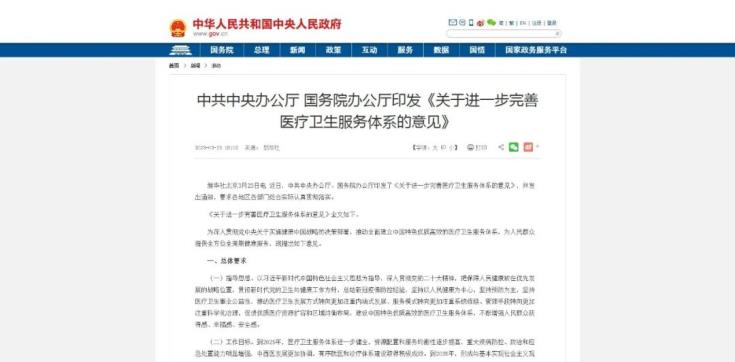 昨日,中共中央辦公廳、國務院辦公廳最新發(fā)布了《關于進一步完善醫(yī)療衛(wèi)生服務體系的意見》?!兑庖姟窂摹皟?yōu)化資源配置,加強人才隊伍建設,推進能力現代化”、“加強分工合作,促進分級診療,推進體系整合化”、“提高服務質量、改善服務體驗,推進服務優(yōu)質化”、“加強科學管理、壓實責任、推進管理精細化”、“深化體制機制改革,提升動力,推進治理科學化”五大方面全面闡述建設中國特色優(yōu)質高效的醫(yī)療衛(wèi)生服務體系的政策措施。