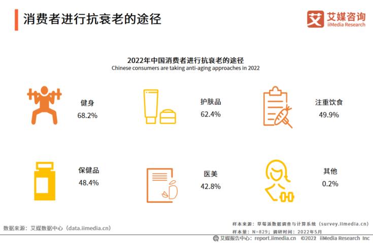iiMedia Research(艾媒咨詢)數(shù)據(jù)顯示,68.2%的消費者通過健身進行抗衰老,62.4%的消費者使用護膚品進行抗衰老,注重飲食和服用保健品進行抗衰老的消費者也有將近五成。艾媒咨詢分析師認為,隨著抗衰老護膚品和保健品成分的迭代升級,將會有更多消費者認可抗衰成分的有效性,并通過使用護膚品和服用保健品進行抗衰老。