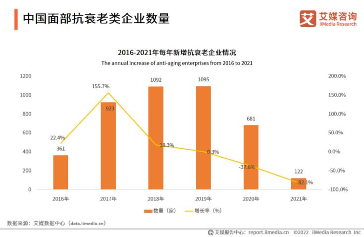 近年來,抗衰老企業(yè)數(shù)量增長迅速,其中2018年和2019年新增抗衰老企業(yè)超過1000家,抗衰老行業(yè)競爭激烈,2020年和2021年受疫情影響,抗衰老新增企業(yè)數(shù)量有所下降。艾媒咨詢分析師認為,隨著人們對抗衰老認識程度的加深,更加追求抗衰老產(chǎn)品的品質(zhì),抗衰老企業(yè)會進一步優(yōu)勝劣汰,企業(yè)新增速度放緩。